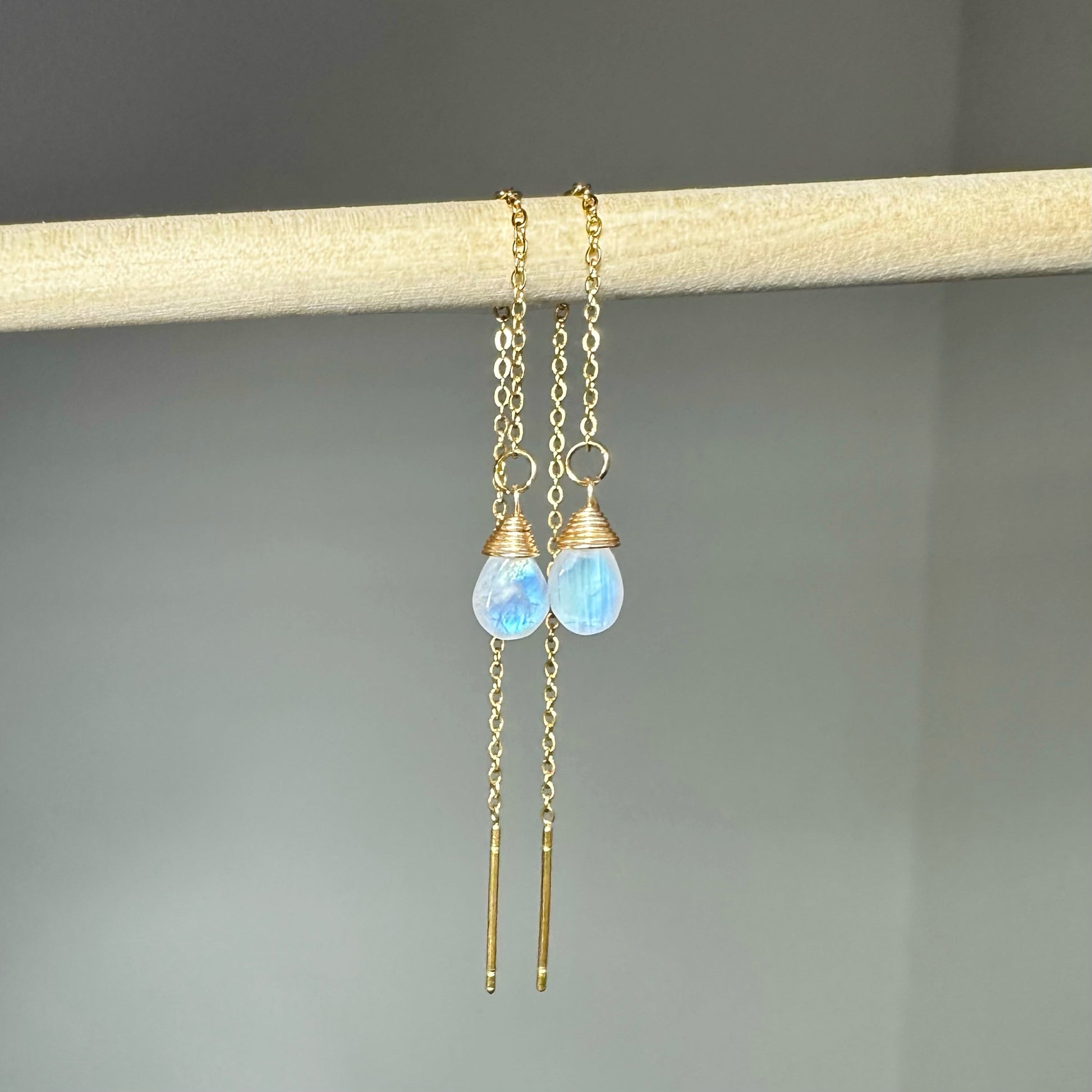 Coppia di orecchini realizzati a mano, con catenina in acciaio inossidabile dorato e filo in rame placcato, con pietra: labradorite bianca.