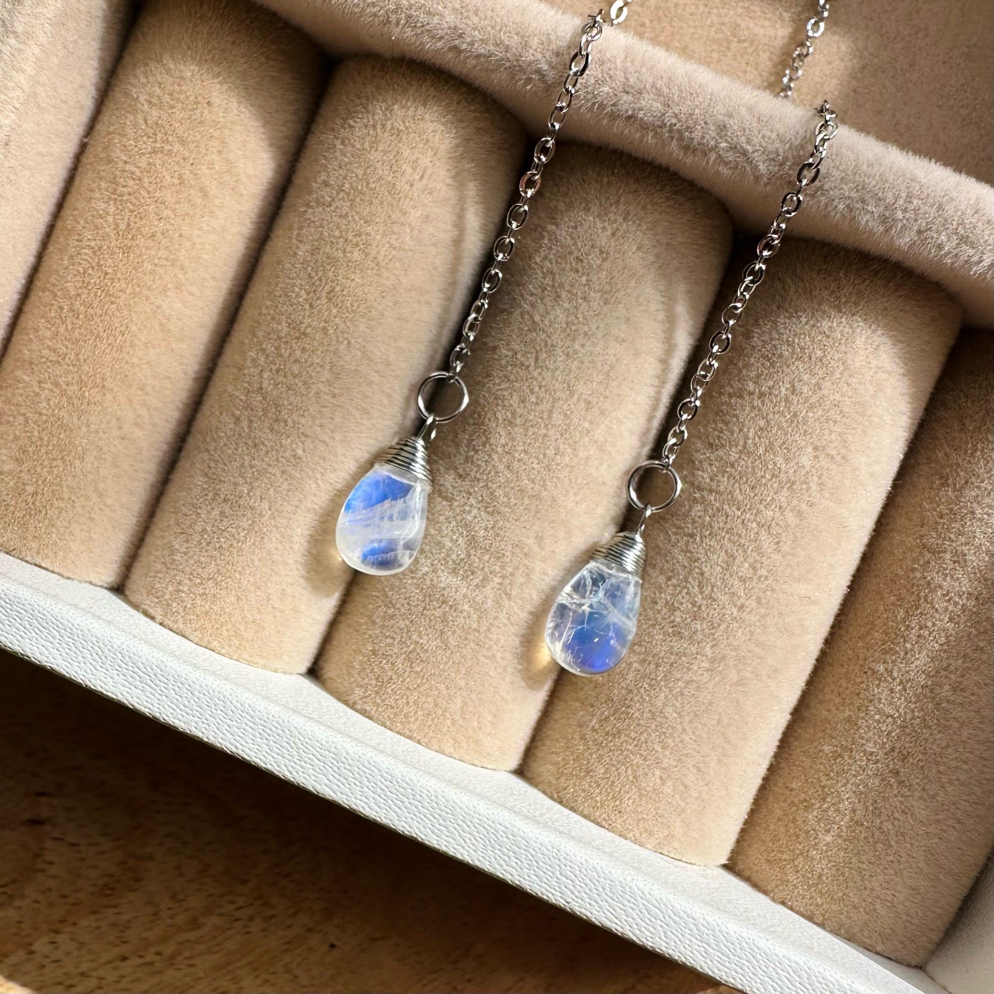 Coppia di orecchini realizzati a mano, con catenina e filo in acciaio inossidabile, con pietra: labradorite bianca.